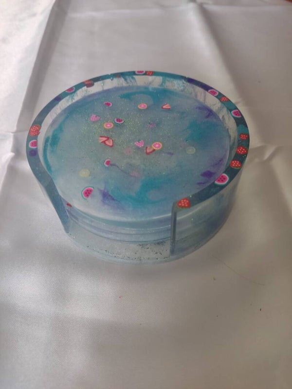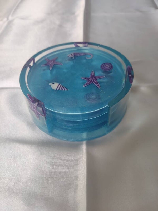 Schöne selbst gemachte Untersetzer aus Epoxidharz mit passenden halter