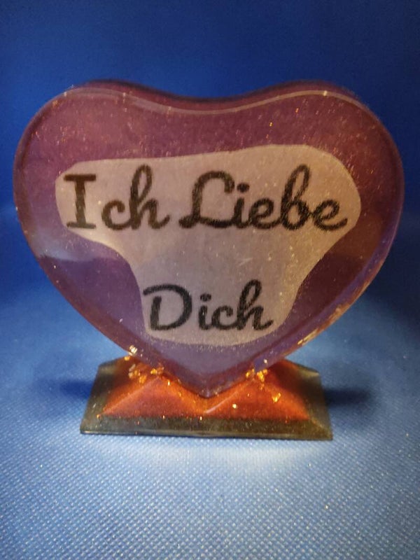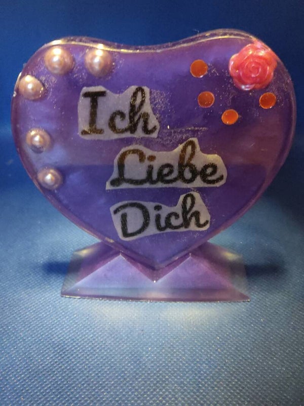 Schöne kleine selbst gestaltete Herzen aus Epoxidharz mit Innenschrift Ich Liebe Dich